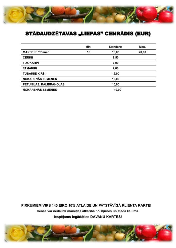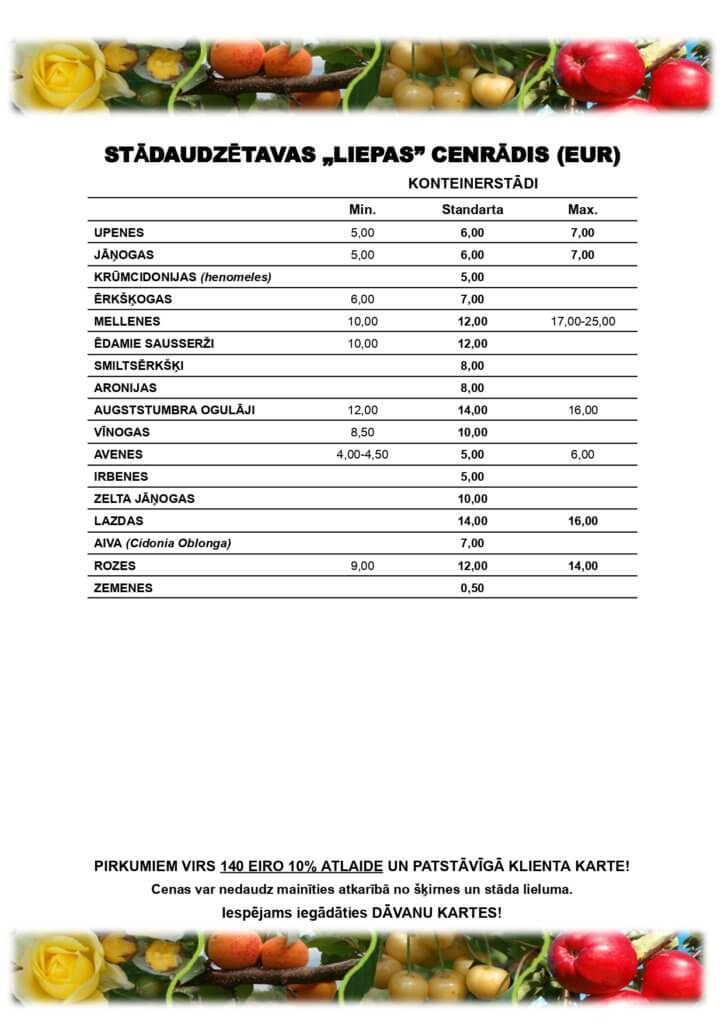 Cenu lapa mūsu augļu kokiem, ogulājiem un rožu stādiem 2026. gadam.