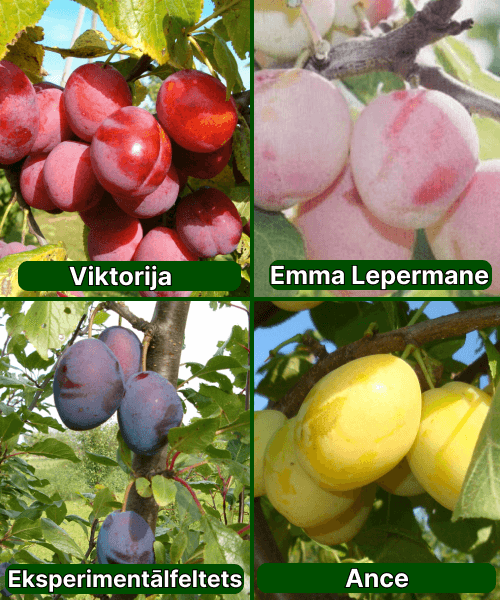 Viktorija– augļi ienākas septembra sākumā/vidū, samērā vienlaicīgi. Tie ir lieli, skaisti, ovāli, spīdīgi, oranždzelteni ar tumšsarkanu virskrāsu, saules pusē violeta. Mīkstums dzeltenā krāsā, stingrs, sulīgs, salds, ar labu garšu, kauliņš labi atdalās.