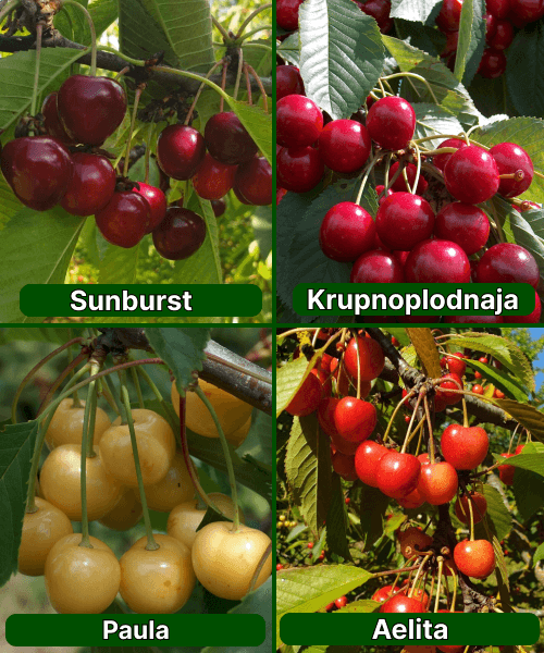 Sunburst– ķirši ļoti lieli, sarkani. Augļa mīkstums blīvs. Nogatavojas jūlija pirmajā dekādē.